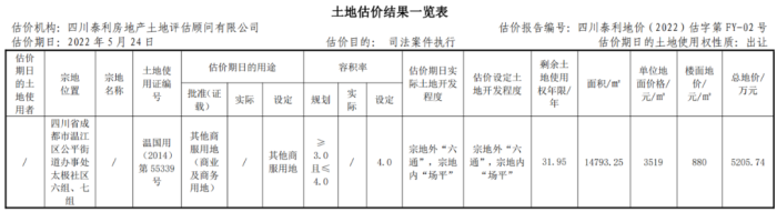 其中,武侯區金花街道地塊的所有人為四川首信實業有限公司,具體擬拍賣武侯區金花街道辦事處七里村三組(B宗)D地塊,其評估價約2.87億元(單位地價約7790元/㎡,樓面地價約2597元/㎡),起拍價約2.01億元,拍賣時間2022年12月12日-13日。