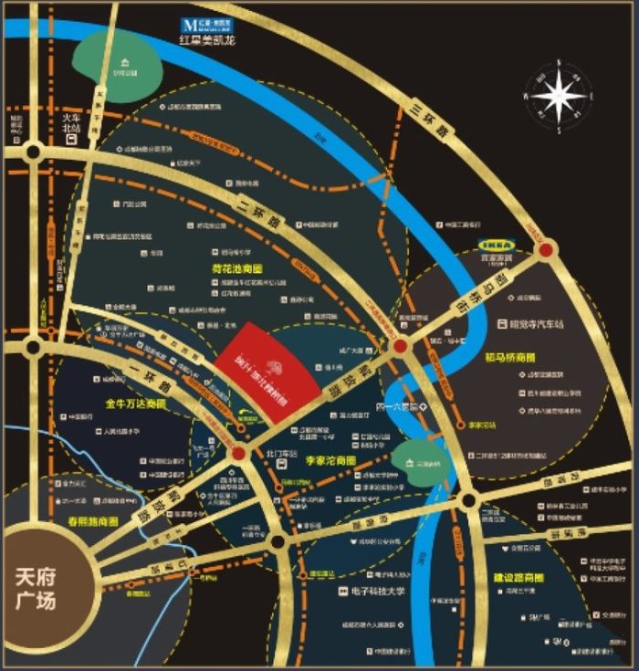 瑞升城北橡樹林南臨一環繁華主干道,北臨二環快速主干道,是集商業辦公住宅為一體的集中式綜合體。該項目周邊有5條地鐵環繞,6號線、7號線、3號線、1號線、18號線,可通達全城。該項目自身自帶3萬方商業,毗鄰金牛萬達,龍湖上城天街廣場,周邊50萬常駐人口,匯集百萬人流,周邊商業氛圍濃厚。加之一環旁優越的地段及四通八達的交通體系,讓瑞升城北橡樹林在城北綜合體項目中獨樹一幟,成為區域內的繁華風向標。