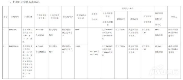 一號宗地編號:DB2020-3。宗地位置:東部新區石盤街道衛星社區8、9、17、18、19組。凈用地面積:43353.33合65.03畝。土地用途及年限:住宅用地70年 。樓面起始價:3820元/平方米。計算容積率:大于43400平方米且不大于86700平方米。建筑密度:不大于30%。建筑高度:滿足航空限高及城市設計要求。拍賣時間:2021年8月3日。