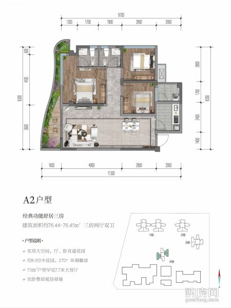 聯想天府云城C區A2戶型(3室2廳,76.45平,南)