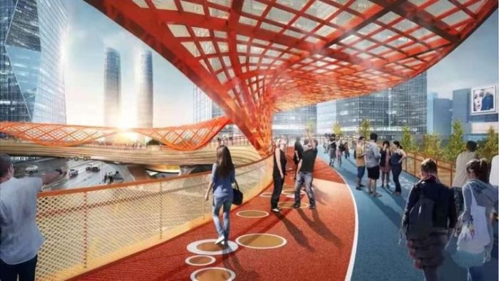“交子之環(huán)”景觀橋是成都網(wǎng)紅橋五岔子大橋的“姊妹篇”,與五岔子大橋一樣,均是通過(guò)建筑結(jié)構(gòu)來(lái)實(shí)現(xiàn)造型之美。“交子之環(huán)”以南宋時(shí)誕生于成都的世界上第一種紙幣‘交子’為設(shè)計(jì)原型,其總體形態(tài),則來(lái)自交子紙幣上的銅錢(qián)紋路,設(shè)計(jì)中用飄逸的曲線展現(xiàn)紙的輕柔。未來(lái),這里將成為融合觀景、休憩、臨時(shí)展覽、時(shí)裝秀、街頭表演等多元場(chǎng)景為一體的空間。該橋建成后,也將成為國(guó)內(nèi)首座擁有多元場(chǎng)景的人行天橋。